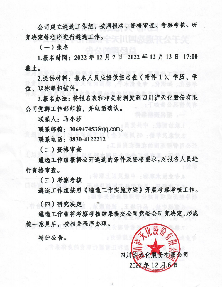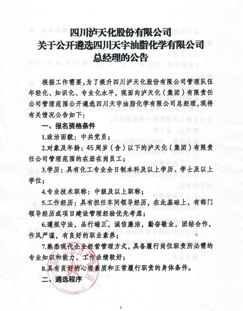 關(guān)于公開遴選四川天宇油脂化學(xué)有限公司總經(jīng)理的公告